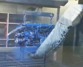 脱脂后一道水洗可设计为热水洗,防止产品带脱脂液带来的起泡沫问题。喷漆室根据需要设计为喷涂一道面漆或者喷涂底漆、面漆各一道。发动机总成一般有一些塑料件和电器元件,这些部件不耐高温,一般选择面漆一般采用60~90℃低温烘干。